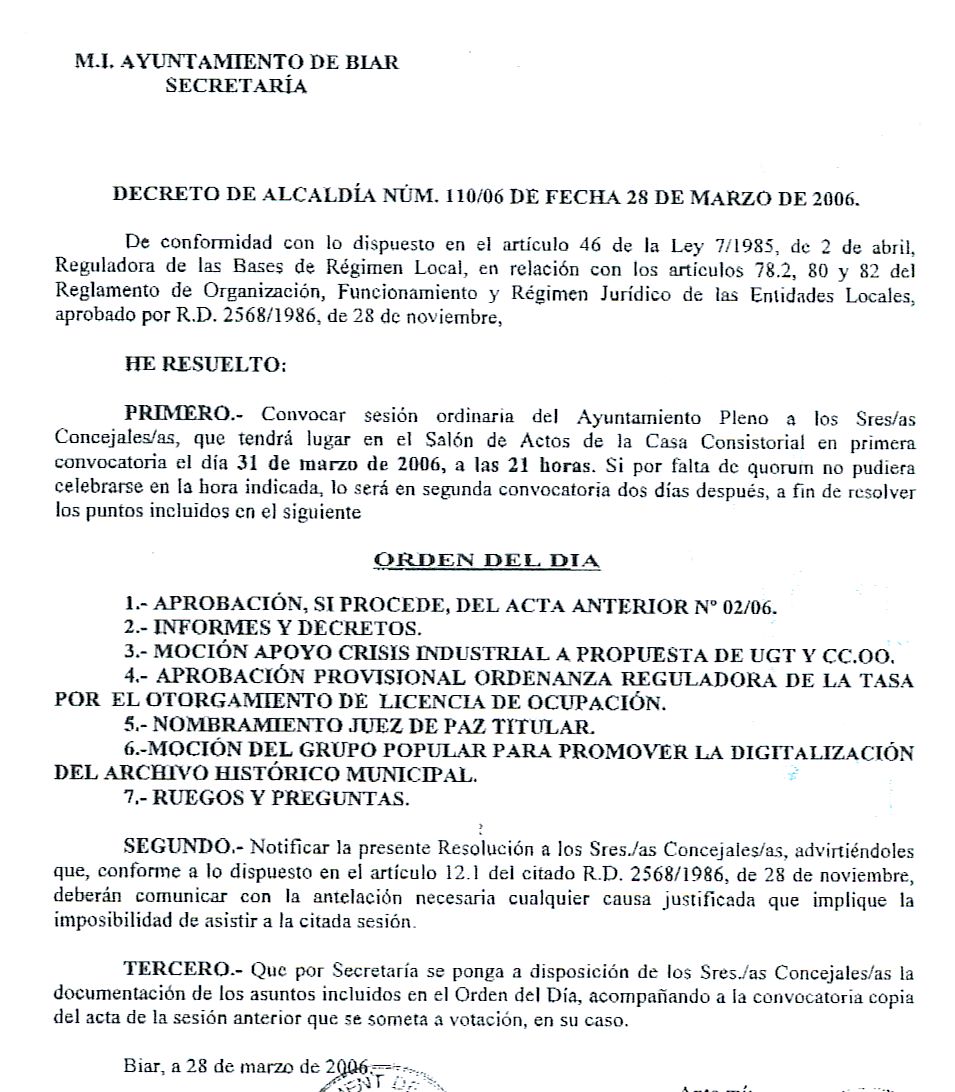 PRIMERO.- Convocar sesión ordinaria del Ayuntamiento Pleno a los Sres/as Concejales/as, que tendrá lugar en el Salón de Actos de la Casa Consistorial en primera convocatoria el día 31 de marzo de 2006, a las 21 horas. Si por falta de quorum no pudiera celebrarse en la hora indicada, lo será en segunda convocatoria dos días después, a fin de resolver los puntos incluidos en el siguiente