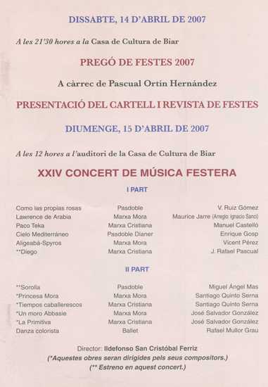El sábado 14 de abril de 2007, a las 21´30 horas tendrá lugar en la casa de cultura de Biar el Acto del Pregón de Fiestas´07, a cargo de D. PASCUAL ORTÍN HERNÁNDEZ. En el mismo acto, se presentará oficialmente el cartel anunciador de las fiestas y el libro-revista de fiestas.