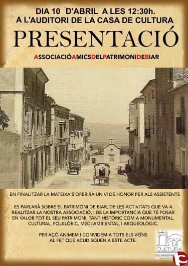 El 10 d´abril es va presentar oficialmente l´associació d´Amics del Patrimoni de Biar. El patrimoni de Biar, les activitats que es duran a terme, i la importància de posar en valor tot el seu patrimoni, tant històric com monumental, cultural, folklòric, medi-ambiental i arqueològic van ser els temes sobre els que es va parlar en la presentació de l´associació a l´auditori de la Casa de Cultura.