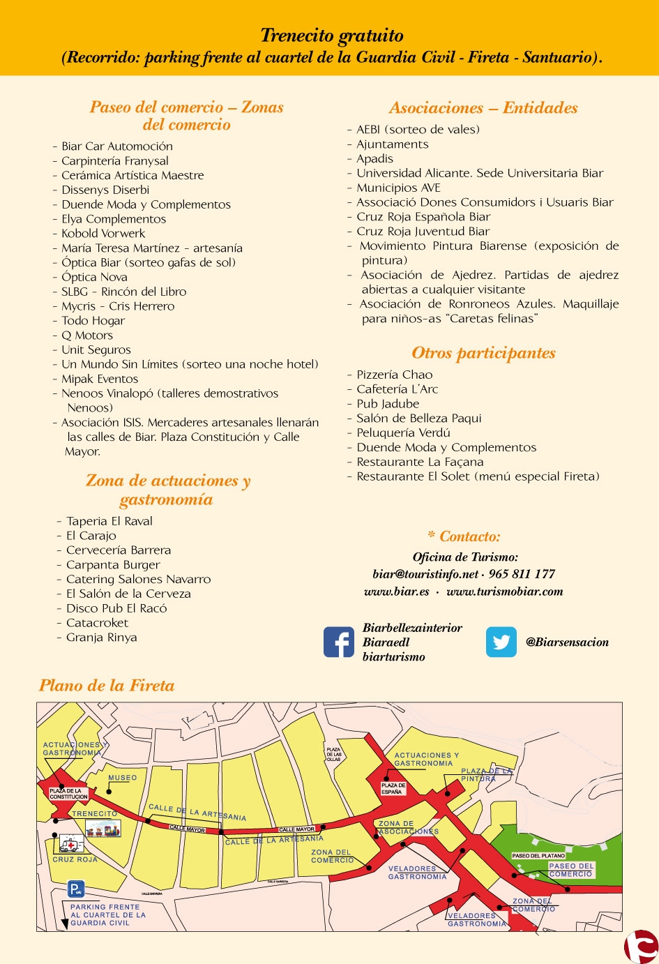 Amb el suport de l’Associació d’Empresaris i Comerciants de Biar (AEBI) i l’Associació d’Artesans i Mercaders ISI, la Fireta comptarà amb la participació de més de 60 expositors i amb la col·laboració de la pràctica totalitat de les associacions locals i un gran nombre d’associacions comarcals.