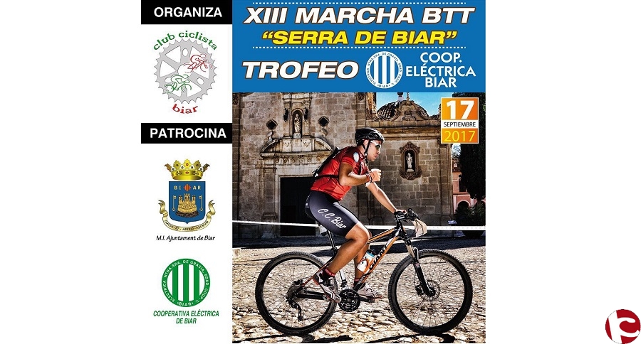 El próximo 17 de septiembre tendrá lugar la XII Marcha BTT «Serra de Biar» a partir de las 9:00h de la mañana desde la Plaza del Convento . Las inscripciones, que tienen un precio de 22€ para federados y de 24€ para no federados, se pueden realizar a través del siguiente enlace: