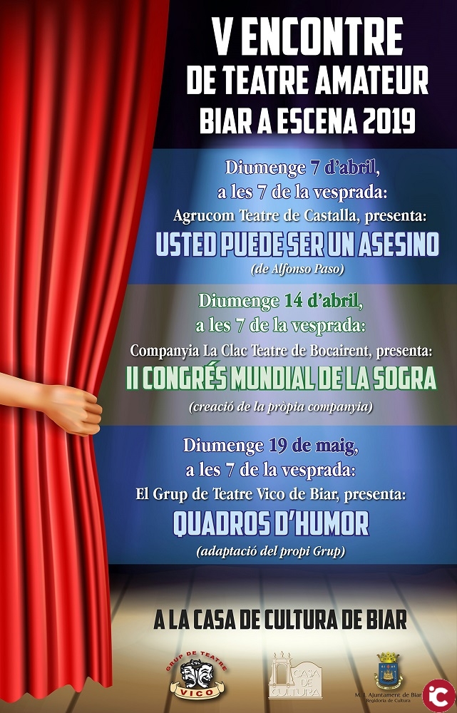 Cartel del V Encontre de teatre amateur-Biar a escena 2019, que se celebrará en la C. Cultura, de Biar, con los siguientes grupos participantes y fechas: