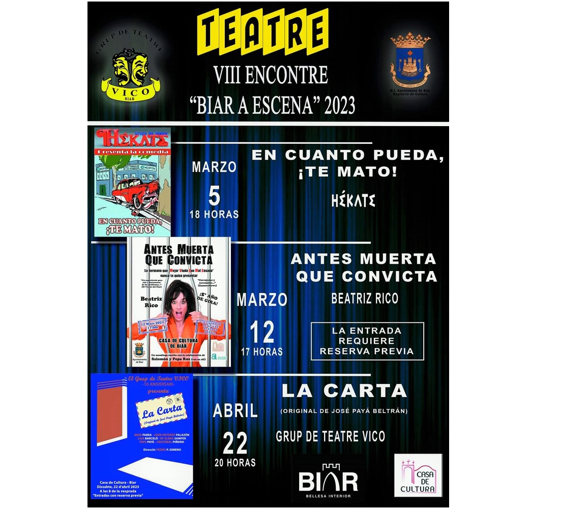 Vuelve el teatro a Biar en su VIII edición del Encontre de Teatre-Biar a escena, que se celebrará en la Casa de Cultura, en los meses de marzo y abril.
