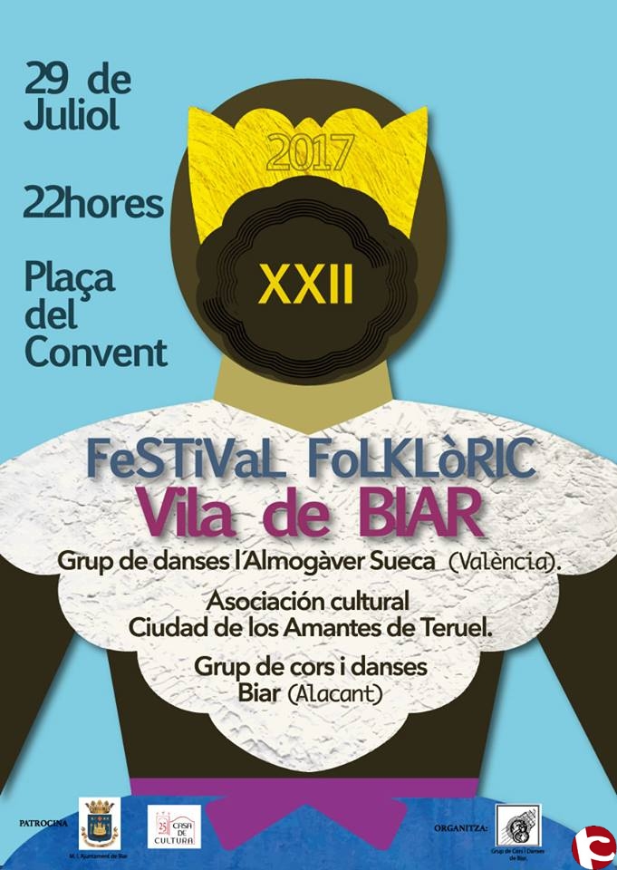 En el bonic marc de la Plaça del Convent, va tindre lloc la XXII edició del Festival Folklòric «Vila de Biar» 2017, que organitza anualment el Grup de Cors i Danses de Biar amb el patrocini del M.I. Ajuntament de Biar. Un festival molt interessant on assistixen grups invitats nacionals com son el Grupo de Danses de l’Àlmogaver Sueca, i la Asociación Cultural de los Amantes de Teruel, que delecten junt amb el Grup de Cors i Danses de Biar als assistents amb estes cançons i balls tradicionals típics.