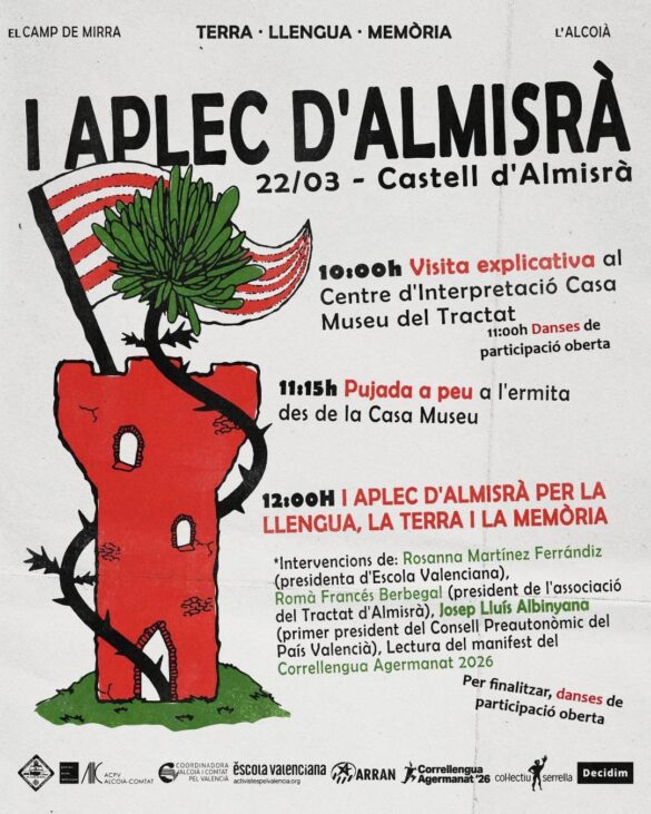 A partir de les 12 h. es realitzarà a l’explanada de l’ermita el I Aplec d’Almisrà per la llengua, la terra i la memòria. Amb la presentació de Rosanna Martínez Ferrándiz, presidenta d’Escola Valenciana, i les intervencions de Romà Francés Berbegal, fundador del Tractat d’Almisrà, i Josep Lluís Albinyana, primer president del Consell Preautonòmic del País Valencià. Seguidament i després de les intervencions, es llegirà el manifest del Correllengua Agermanat 2026.