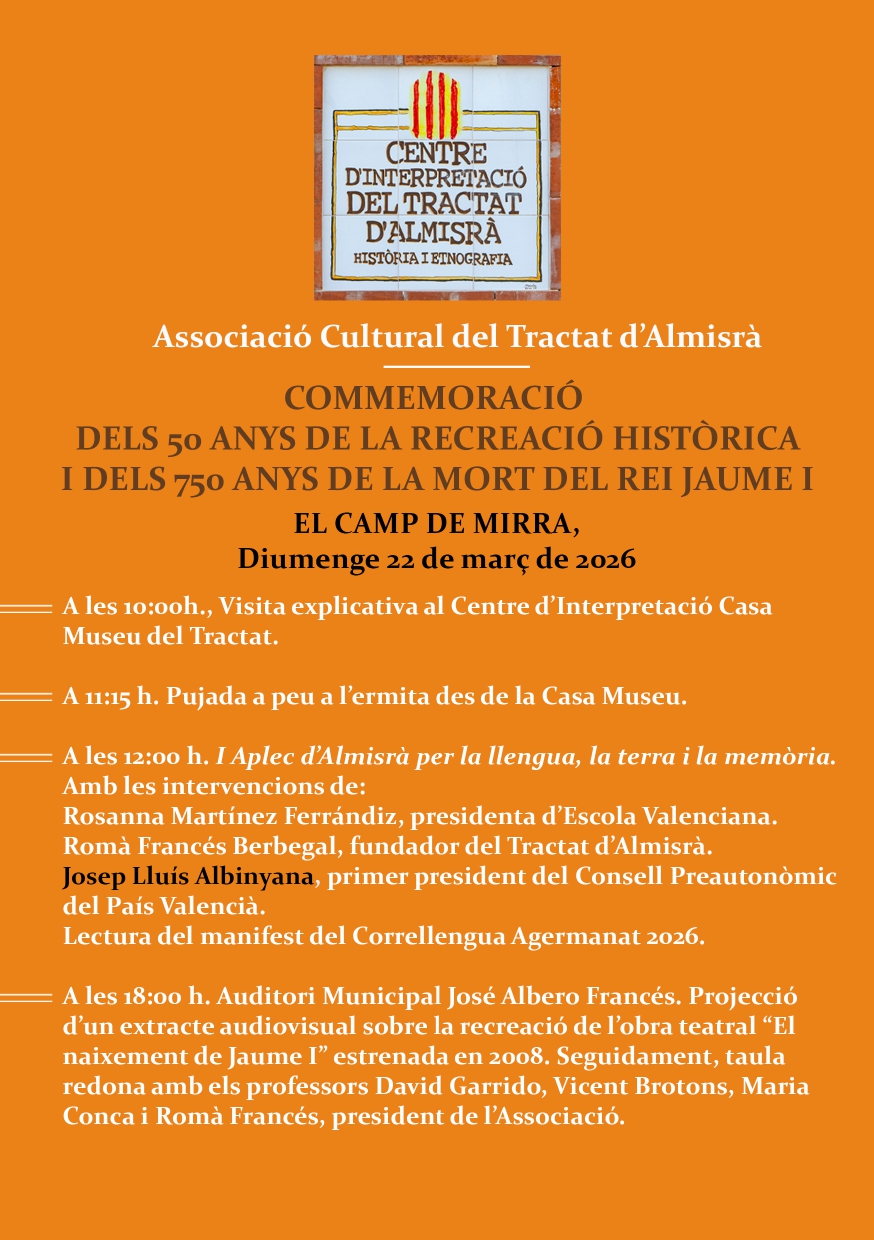 Diumenge 22 de març, el Camp de Mirra recorda un any més la data històrica de la signatura del Tractat d’Almisrà, organitzant des de l’Associació Cultural tot un seguit d’actes per recordar el que va suposar aquell 26 de març de 1244, en la commemoració del 782 aniversari de la signatura. Data història a la que s’hi suma la de la primera posada en escena del Tractat d’Almisrà en novembre de 1976, fa 50 anys, i també la commemoració del 750 aniversari de la mort del rei Jaume I.