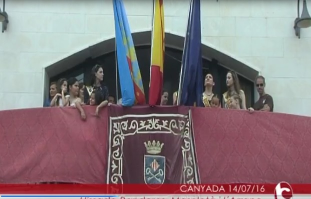 Des de la balconada del M.I. Ajuntament i després de l´Àngelus, s´hissaren les banderes Nacional, de la Comunitat Valenciana i de la Comunitat Europea, sonant els respectius himnes que van estar a càrrec de la estimada «Societat Unión Musical de Cañada». Van presidir l´acte les autoritats municipals, Reines de Festes i Corts d ´Honor.