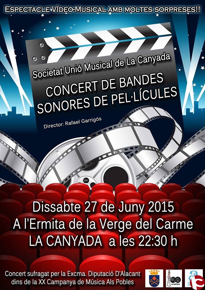 La Sociedad Unión Musical de Cañada dirigida por Rafa Garrigós realizará un concierto de bandas sonoras de películas el próximo Sábado 27 de Junio. El concierto tendrá lugar en la ermita de la Virgen del Carmen de Cañada a las 22,30 horas, y en él se podrán escuchar 23 bandas sonoras y se podrá disfrutar de un espectáculo video-musical con muchas sorpresas. El evento está sufragado por la Excelentísima Diputación de Alicante dentro de la XX Campaña de Música Als Pobles.