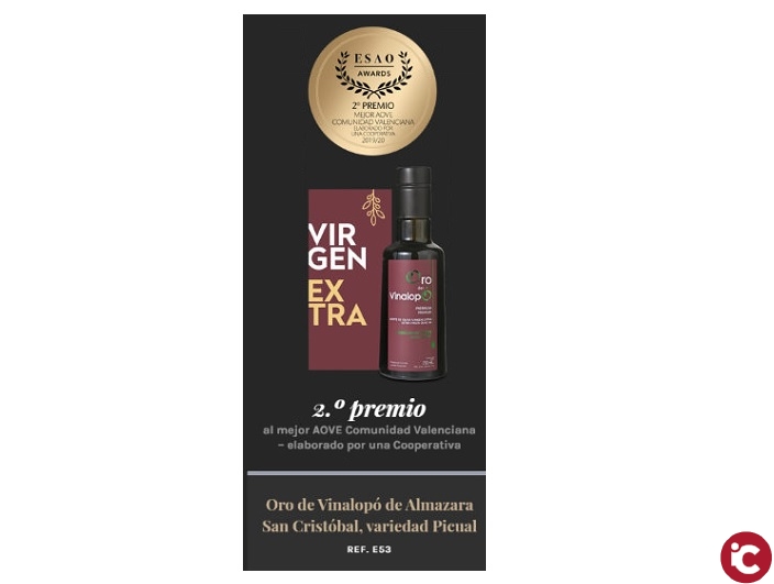 En esta ocasión, la Escuela Superior de Aceite de Oliva le ha otorgado el segundo lugar en la categoría de al mejor AOVE Comunidad Valenciana elaborado por una cooperativa en su concurso anual ESAO Awards.