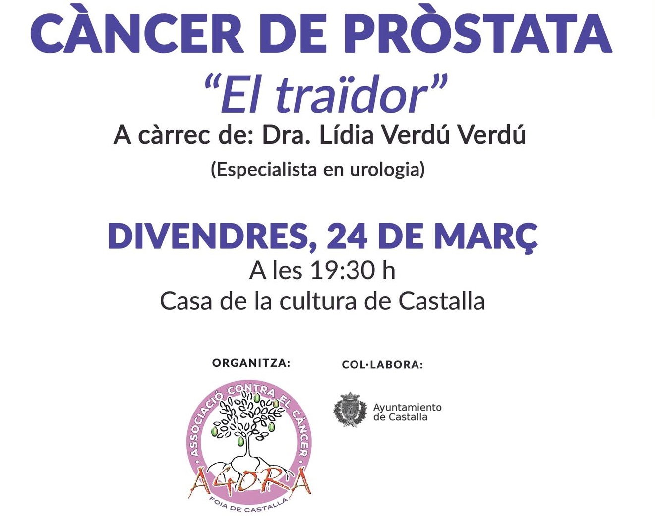 L’ associació contra el càncer Àgora – Foia de Castalla amb el suport d’Ajuntament de Castalla han desenvolupat aquesta activitat dirigida per una especialista en urologia, Dra. Lídia Verdú Verdú, per a donar visibilitat, coneixement i suport a aquesta mena de càncer que està situat com el segon amb més repercussió, malgrat ser un tema taboo.