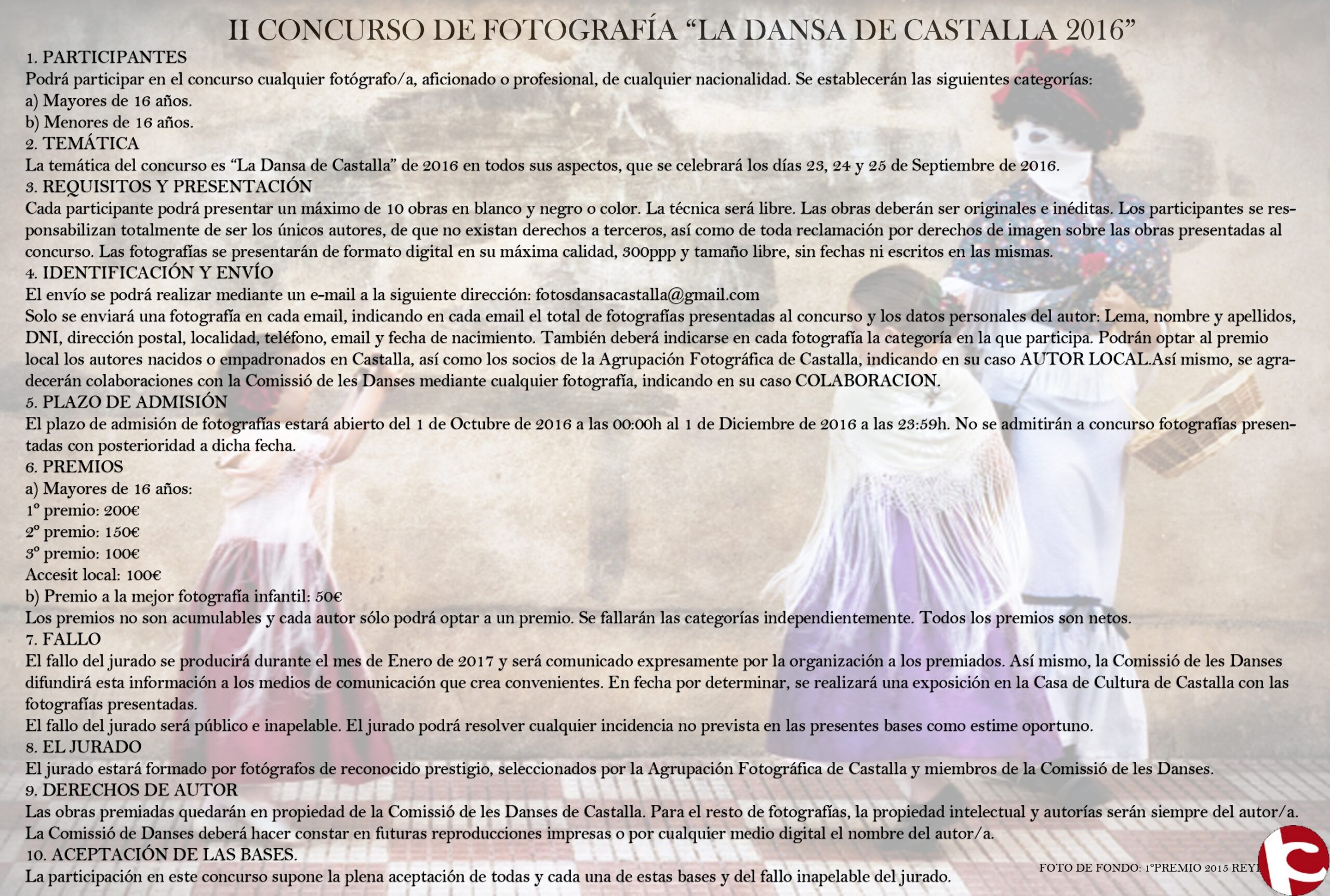 El envío se podrá realizar mediante un e-mail a la siguiente dirección: fotosdansacastalla@gmail.com