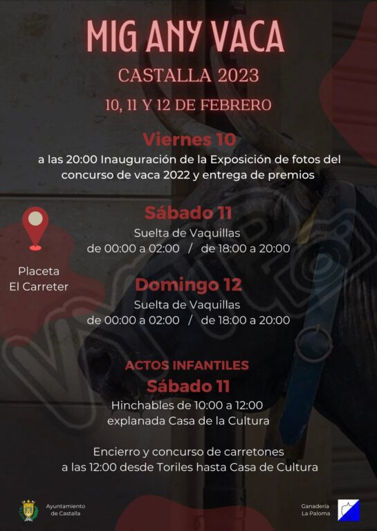 En concret, la programació d’activitats municipals es distribueix de la següent manera: El divendres 10 de febrer arranquen els actes, amb la inauguració oficial de l’exposicio de fotos del concurs de vaca 2022 a partir de les 20:00 hores a la Casa de Cultura. Posteriorment, es realitzarà l’entrega de premis a les millors instantànies de la celebració. Per la nit, a partir de les 00:00 hores i fins a les 2:00 de la matinada, tindrà lloc la primera soltada de vaquilles des de la placeta El Carreter, epicentre de totes les activitats.