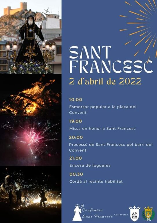 El porper dissabte 2 d’abril, Castalla celebrarà la festivitat de Sant Francesc amb diverses activitats, totes concentrades en la vesprada d’aquest dia. Una programació d’actes religiosos i populars, fogueres i cordà en el recinte habilitat, perquè tots el veïns i visitants puguen gaudir d’un dia d’alegria i festa.