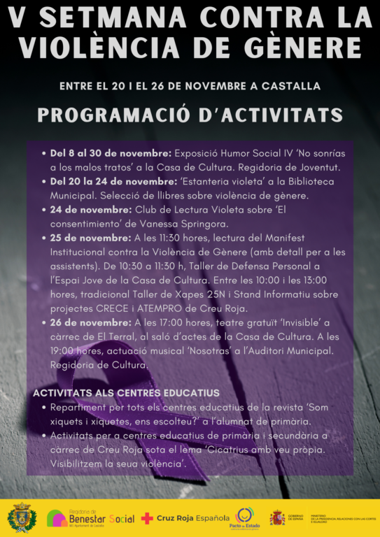 El Ayuntamiento de Castalla está listo para la celebración de la V Semana Contra la Violencia de Género, entre los días 20 y 26 de noviembre. La concejalía de Bienestar Social ha preparado un completo programa de actividades, coincidiendo con la conmemoración del Día Internacional de la Eliminación de la Violencia contra la Mujer, el sábado 25 de noviembre.