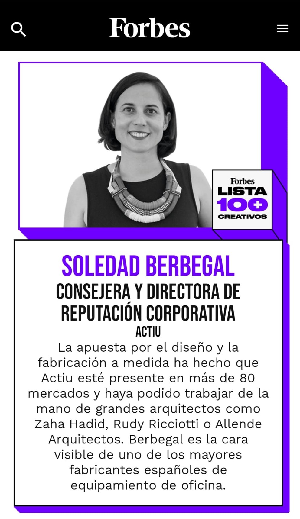 Soledat Berbegal, Consejera y directora de reputación de marca de Actiu, ha sido incluida en la lista Forbes Los 100 españoles más creativos en el mundo de los negocios.