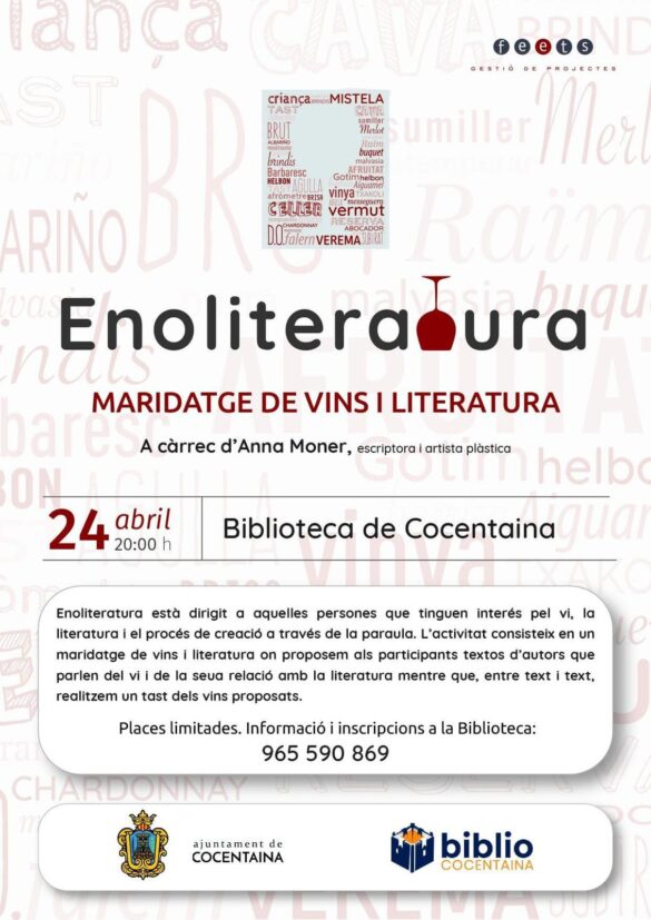 El dimecres 24 d’abril a les 20 hores, Anna Monner, escriptora i artista plàstica, ens proposa un taller d’«Enoliteratura. Maridatge de vins i literatura»; on, a través de textos de Vicent Andrés Estellés, James Joyce o Virginia Woolf; així com el tast de diversos vins, descobrirem la relació que existeix entre aquests dos elements que, en principi, semblen tan allunyats. Cal recordar que les places són limitades i completament gratuïtes. Els interessats hauran de telefonar al número de la Biblioteca: 965 590 869.