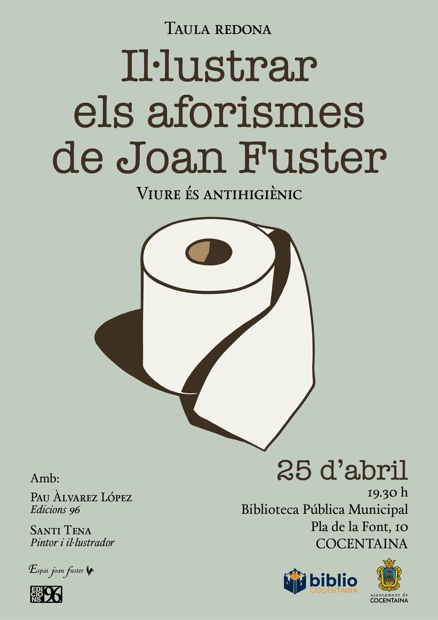 El dijous 25 d’abril a les 19:30, en canvi, gaudirem d’una taula redona on, sota el títol «Il·lustrar els aforismes de Joan Fuster», podrem escoltar Santi Tena, pintor i il·lustrador, que ens explicarà com ha sigut el procés creatiu de traduir en imatges un dels gèneres més importants de l’escriptor de Sueca.