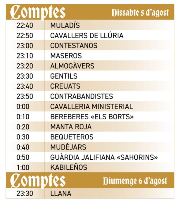 Aquest dissabte desfilaran, a partir de les 22:40 hores, les Filaes Muladís, Cavallers de Llúria, Contestans, Maseros, Almogàvers, Gentils, Creuats, Contrabandistes, Cavalleria Ministerial, Berebers «Els Borts», Manta Roja, Bequeteros, Mudèjars, Guàrdia Jalifiana «Sahorins» i Kabilenyos.