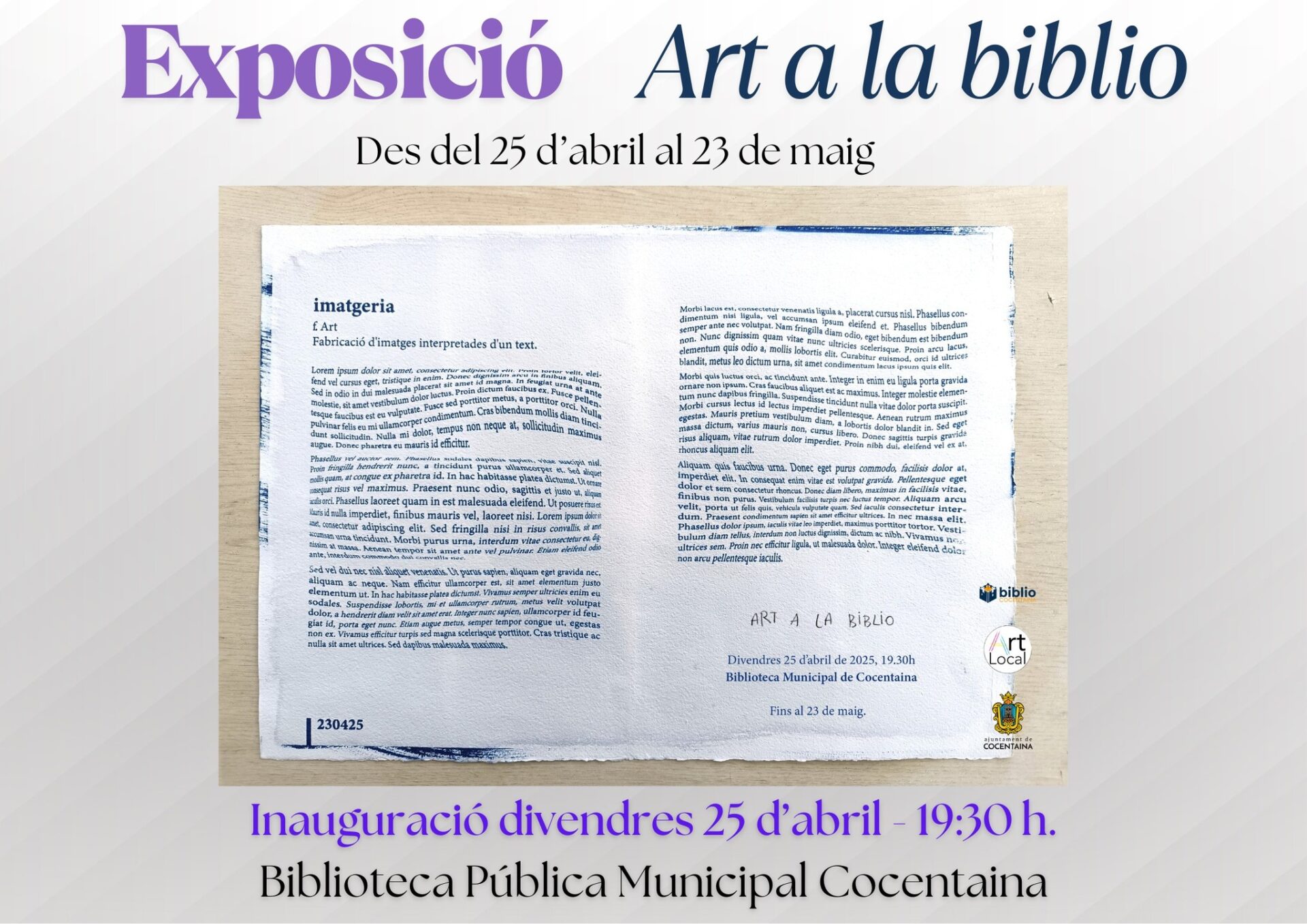 L’endemà, el divendres 25 d’abril, s’han programat dues activitats en diferents espais de Cocentaina. A les 17:30 hores podrem gaudir d’una animació lectora i altres multiactivitats a càrrec dels Júniors Generació Oberta a la Llibreria i Papereria l’Ocellet de Colors. Tot seguit, a les 19:30 hores, la Biblioteca Municipal acull un nou acte: la inauguració de l’exposició «Imatgeria. Art a la biblio», a càrrec del col·lectiu d’Art Local. Una exposició que es podrà visitar fins al 23 de maig.