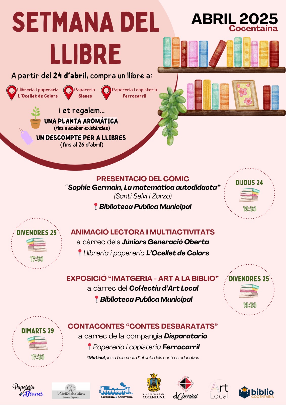 Així les coses, entre el 24 i el 26 d’abril, si adquireixes un llibre a la Llibreria i Papereria l’Ocellet de Colors, la Papereria Blanes o la Papereria i Copisteria el Ferrocarril, a més de descomptes en llibres, rebràs de regal una planta aromàtica (fins a esgotar les existències).