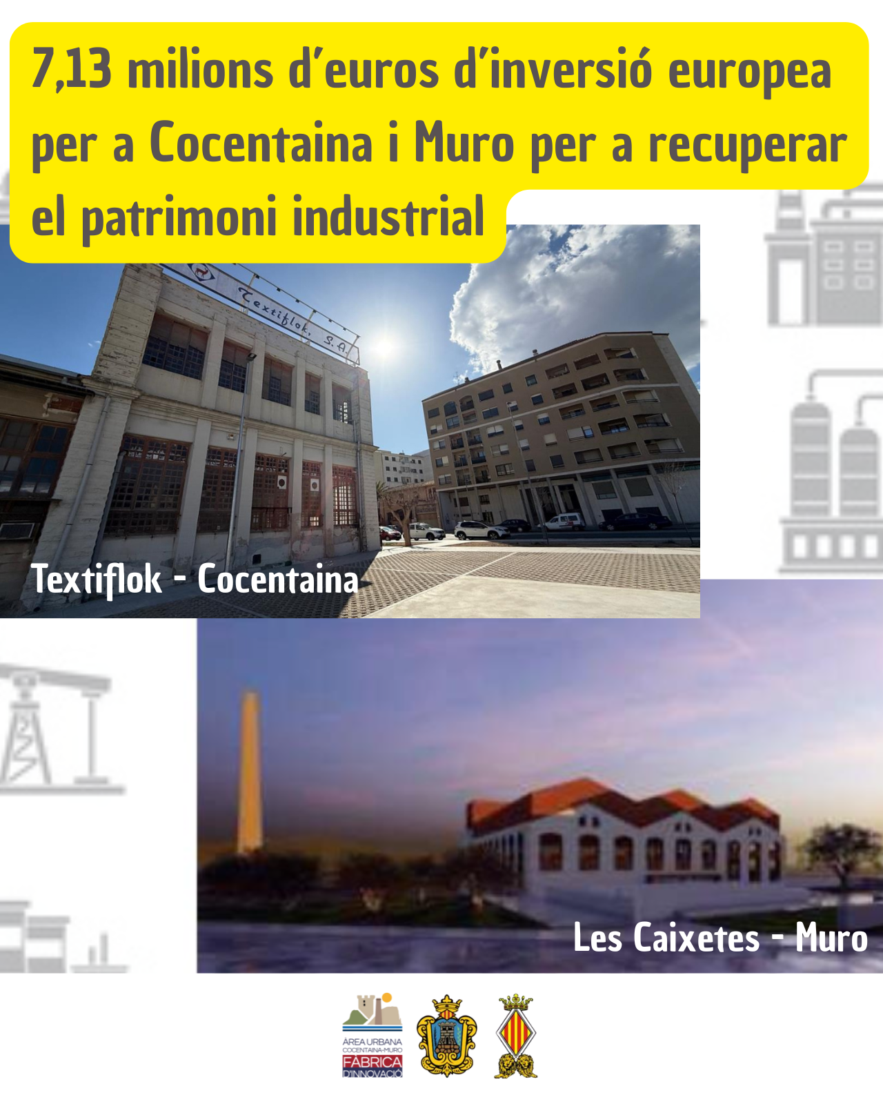 Muro i Cocentaina mobilitzen una inversió pública estimada en 7,13 milions d’euros vinculada a fons europeus FEDER per a impulsar un pla d’actuació integral de la mà del Ministeri d’Hiseanda. D’eixa xifra, 4,28 milions d’euros corresponen a l’ajuda europea (60% del total) i la resta és cofinançament municipal, amb una aportació conjunta aproximada de 2,85 milions d’euros entre ambdós consistoris.
