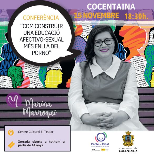 Els actes s’inicien el divendres 15 de novembre amb dues activitats a càrrec de Marina Marroquí, educadora social i especialista en violència de gènere, qui ha impartit tallers i formació a més de 200.000 adolescents, així com a professionals de l’àmbit policial, sanitari o jurídic. A les 11:30 hores, al Centre Cultural El Teular, ofereix un monòleg que, sota el títol «Eso no es sexo», s’adreça als alumnes de secundària de l’IES Pare Arques i el Col·legi Sant Francesc d’Assís. A la vesprada, però, imparteix la conferència «Cómo construir una educación afectivo-sexual más allá del porno», també al Centre Cultural El Teular i a les 18:30 hores.