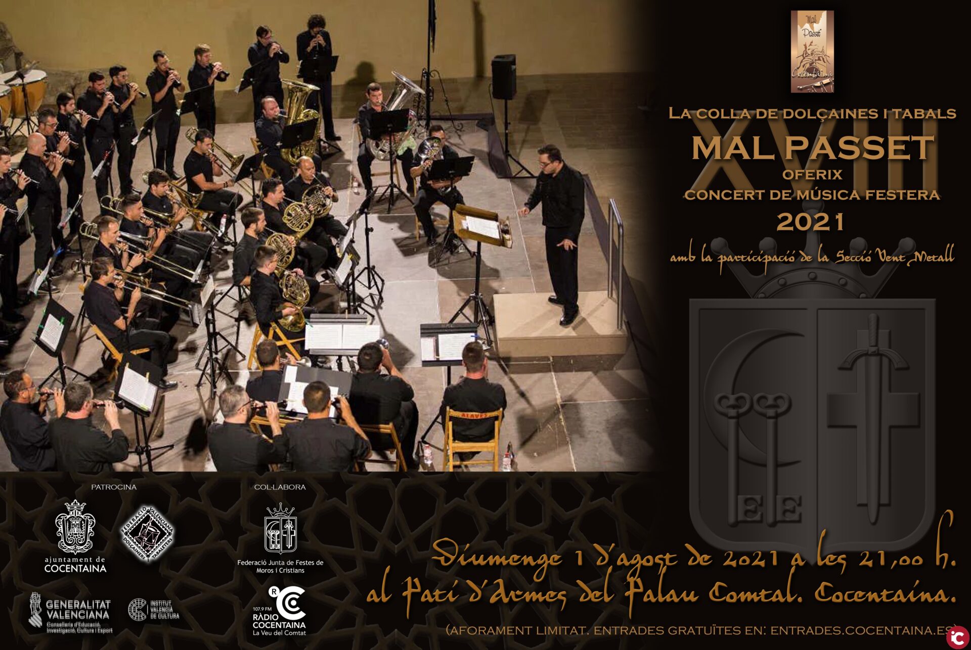 La Colla de Dolçaines i Tabals Mal Passet de Cocentaina oferirà el concert de Música Festera, en la seua 18ª edició, el diumenge 1 d’agost de 2021 a les 21:00h al Pati d’armes del Palau Comtal de Cocentaina.