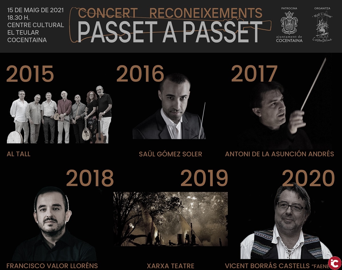 El proper dissabte 15 de març de 2021 a les 18:30h al Centre Cultural de Cocentaina tindrà lloc la XVIIa edició del Festival de Colles que organitza anualment la colla Mal Passet. Aquest any tan diferent i difícil, la colla vol retre un homenatge a tots els qui ens han acompanyat al llarg daquestos últims 12 anys en el Reconeixement Passet a Passet. És per aixó que baix el lema CONCERT RECONEIXEMENTS PASSET A PASSET la colla de dolçaines i percussió contestana dedicarà una peça a cadascun dels guardonats. Baix la batuta de Francisco Valor Lloréns, la colla interpretarà peçes com Al Tall x sempre de Saül Gómez Soler, el Tanina de Cocentaina, la Malaguenya de Barxeta o Dependents de José Rafael Pascual Vilaplana, entre altres.