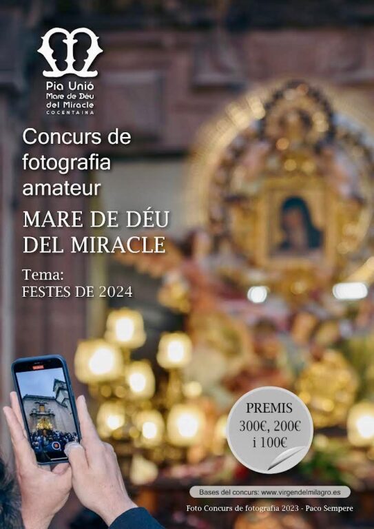 Davant l’èxit de l’any passat (161 imatges presentades), la Pia Unió ha tornat a llançar les bases del concurs de fotografia, no es tracta de pillar la millor panoràmica sinó de plasmar cada moment que la trilogia mariana ens deixa: eixos instants que queden, eixa imatge que moltes vegades es converteix en fons de pantalla, perfil de whatsapp i en una història a les xarxes socials…la imatge descriu i eixa crònica gràfica forma part també de la nostra festa.