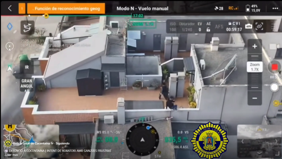 Gràcies a l’ús del dron policial, els agents han pogut localitzar els sospitosos amagats sobre la teulada d’un edifici paral·lel. En detectar la presència del dron, els dos homes han iniciat la fugida pels terrats, fet que ha provocat una persecució policial.