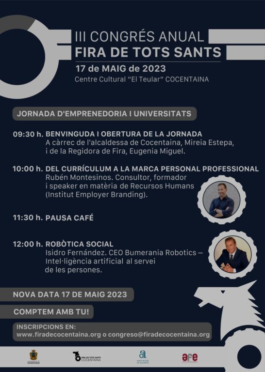 En la primera jornada, dirigida a emprenedors i universitats, es parlarà de com construir la marca personal professional. Rubén Montesinos, consultor, i formador en RH de l’Institut Employer Branding, aportarà les tècniques claus per a identificar els elements que han de ser presents en la teua marca personal: la imatge que projectes, com et perceben els altres, professionalment, quines característiques i valors transmets, entre altres. La robòtica també s’obrirà pas en aquest primer dia de congrés. Isidro Fernández, CEO de Bumerania Robotics, parlarà de com la robòtica interactua amb els humans i facilita i millora processos segons les funcions que se’ls associen.