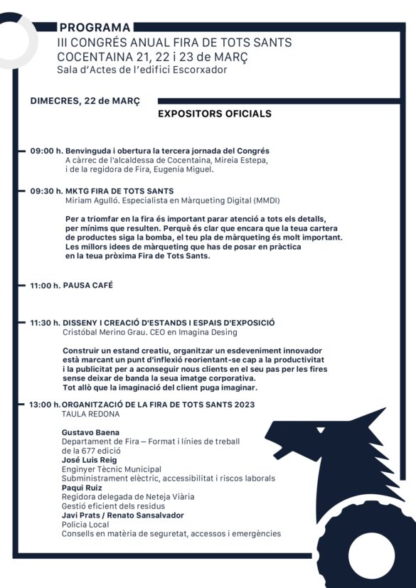 El dimecres 22, els protagonistes seran els expositors oficials que cada any fan possible que el certamen siga un gran aparador comercial de primer nivell. La jornada començarà amb el màrqueting com a protagonista. Miriam Agulló especialista en aquest camp donarà als expositors claus i recursos per a millorar el seu pla de màrqueting de cara a la pròxima edició de l’esdeveniment. El disseny, un altre dels pilars fonamentals, també estarà damunt de la taula amb Cristóbal Merino, CEO de Imagina Design. Aquest oferirà als participants idees per a construir un estand creatiu i com innovar en matèria de publicitat per a aconseguir nous clients sense descurar la imatge corporativa. Aquesta tercera jornada es tancarà amb una taula redona que se centrarà en oferir les principals qüestions que es tenen en compte per a organitzar l’esdeveniment. En ella participaran Gustavo Baena del departament de la Fira de Cocentaina; José Luis Reig, Enginyer Tècnic Municipal i Paqui Ruiz, edil de Neteja Viària. Junts parlaran del format i línies de treball de l’esdeveniment, accessibilitat, gestió eficient de residus i consells en matèria de seguretat i emergències.