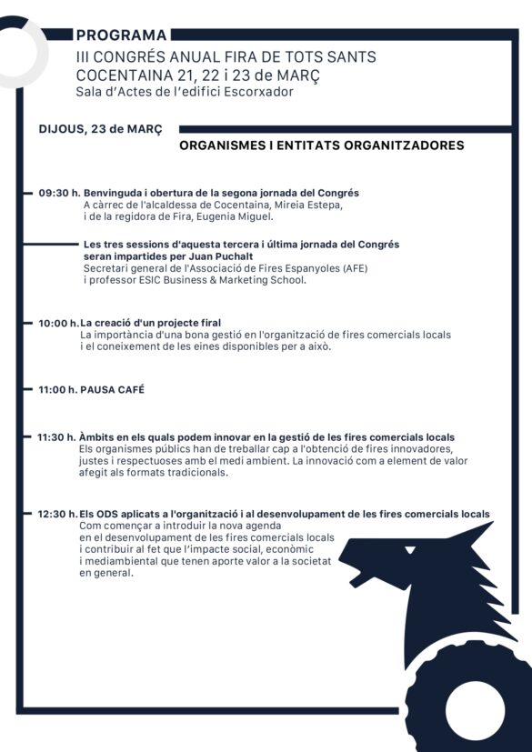 Per a tancar aquesta tercera edició, l’última jornada està dirigida a organismes i ens organitzadors de la Fira de Tots Sants. Juan Puchalt, secretari general de l’Associació de Fires Espanyoles (AFE) i professor de ESIC Bussiness & Marketing School, oferirà tres ponències sobre la creació d’un projecte firal, innovació en la gestió, i finalment com aplicar els ODS i l’Agenda 2030 en aquesta mena d’esdeveniments.