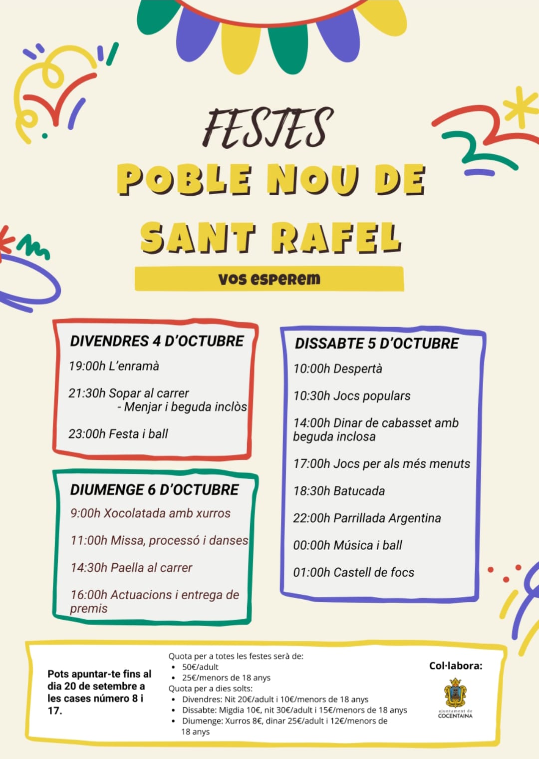 Des del divendres 4 d’octubre fins al diumenge 6 d’octubre, la pedania de Cocentaina, El Poble Nou de Sant Rafel, celebra les seues festes patronals amb un calendari ple d’activitats per a tots els veïns i veïnes.