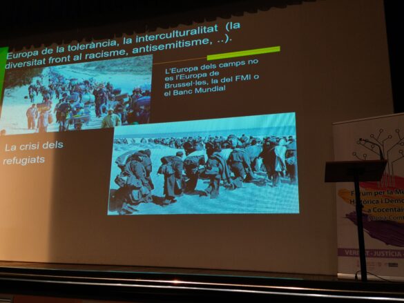 La primera part de l’acte va comptar amb una conferència a càrrec del membre del Comité Internacional del Camp de Concentració de Buchenwald, Enric Garriga, qui també és fill de Marcel•lí Garriga, qui va estar deportat al camp de concentració de Buchenwald i va redactar les seues memòries en l’obra ‘Un vilanoví a Buchenwald’. Durant la conferència, Enric Garriga va explicar la importància de l’internacionalisme en la lluita contra el feixisme, així com la necessitat d’educar en aquests fets de “recuperar la Memòria”, donada la vigència dels valors de la II República, que hui dia es troben presents en els Drets Humans i els Drets Civils, així com en els Objectius de Desenvolupament Sostenible (ODS) i l’Agenda 2030. En aquest sentit, Garriga va afirmar que “els projectes locals de Memòria Històrica passen per posar nom i cara dels deportats”.