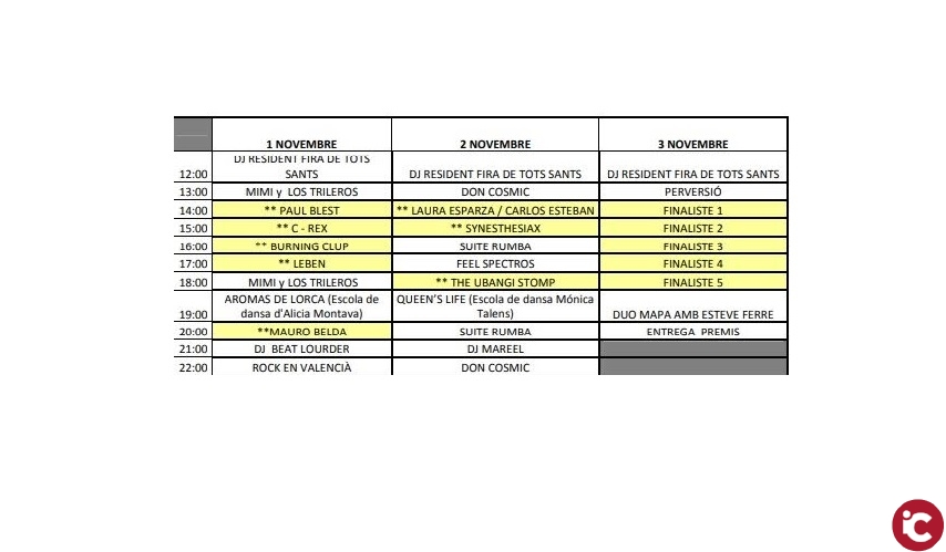 A més, com ja és habitual, la plaça Mossén Eugenio Raduán acollirà lEspai Sol a Sol que en aquesta cinquena edició combinarà participants en el concurs en modalitat de música, amb actuacions dalguns guanyadors dedicions passades, djs i dos espectacles de ball de les acadèmies de la localitat. Les actuacions tindran lloc des de les 12h fins a les 22h de manera ininterrompuda, a diferència del diumenge 3 de novembre que finalitzarà a les 20h amb el lliurament de premis.