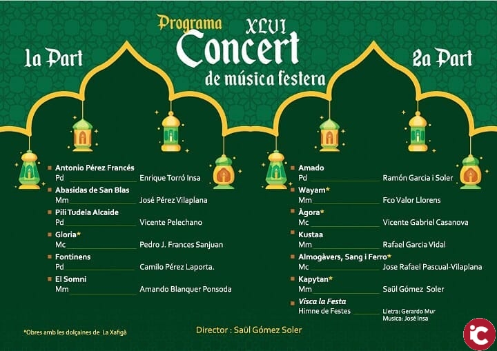 El XLVI Concert de Música Festera de la Unió Musical Contestana és hui dijous 9 d’Agost a les 22.30h al Palau Comtal de Cocentaina ➕🌙 . Els compositors convidats són Vicent Pelechano, Vicent Casanova, Rafa Garcia, Ramon Garcia i Jose Rafael.