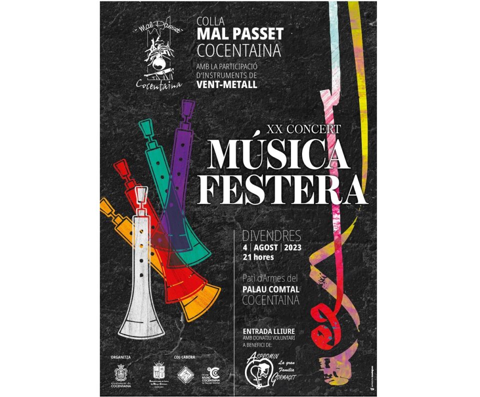 La Colla de Dolçaines i Tabals Mal Passet de Cocentaina oferirà el Concert de Música Festera en la seua 20a edició, el divendres 4 d’agost de 2023 a les 21:00h al Pati d’armes del Palau Comtal de Cocentaina.