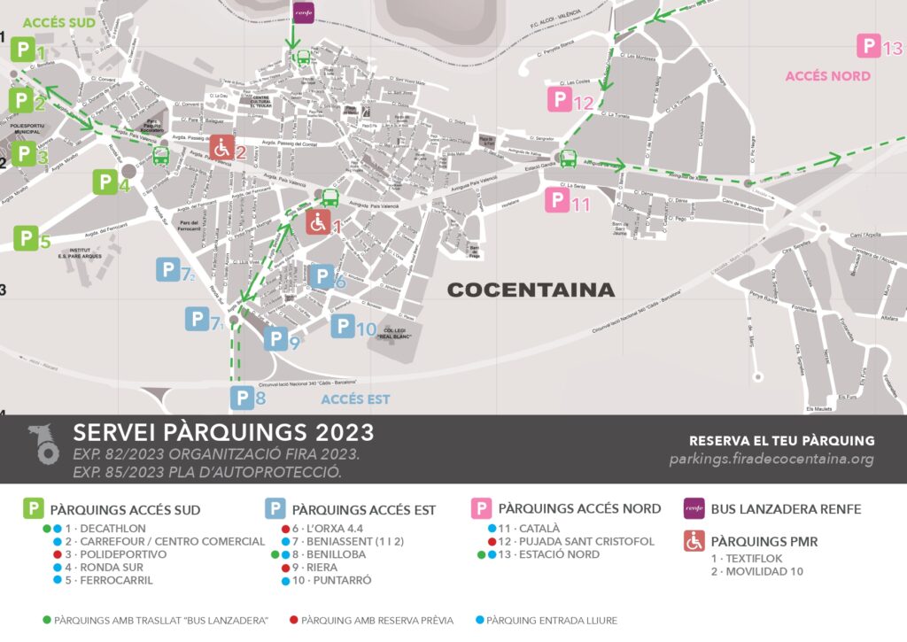 Tot i ser un servei molt demandat des que s’ha posat en marxa, l’opció de reserva prèvia no és l’única possible. Com apuntàvem, en total hi ha 13 zones d’estacionament repartides per tot el municipi, 9 d’elles d’accés lliure, entre les entrades sud, est i nord de la població. Segons l’organització de la Fira, hi ha disponibles més de 153.000 metres quadrats d’aparcament per acollir als visitants que arriben a Cocentaina entre els dies 1 i 5 de novembre d’enguany.