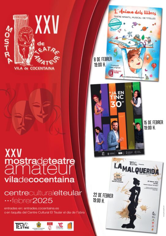 La XXV Mostra de Teatre Amateur «Vila de Cocentaina» s’inicia el dissabte 8 de febrer a les 19:00 amb el teatre infantil, musical i de titelles «L’ànima dels llibres», a càrrec de DesBaratats Teatre (Alacant). Aquesta representació ha estat possible gràcies al suport de la Seu Universitària a Cocentaina de la Universitat d’Alacant (UA).