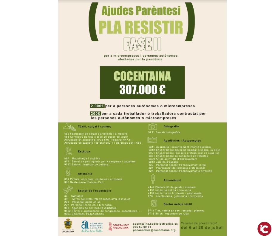 Aquestes ajudes es dirigeixen als autònoms i empreses amb un màxim de 10 treballadors que tinguen el domicili fiscal a Cocentaina. En aquesta ocasió van dirigides a sectors com el comerç minorista, estètica, sectors de lespectacle, acadèmies densenyament, és a dir, tots aquells sectors que no estaven en la convocatòria de les Parèntesi I. Tots els epígrafs de les activitats beneficiàries es contemplen a lannex de les presents bases.