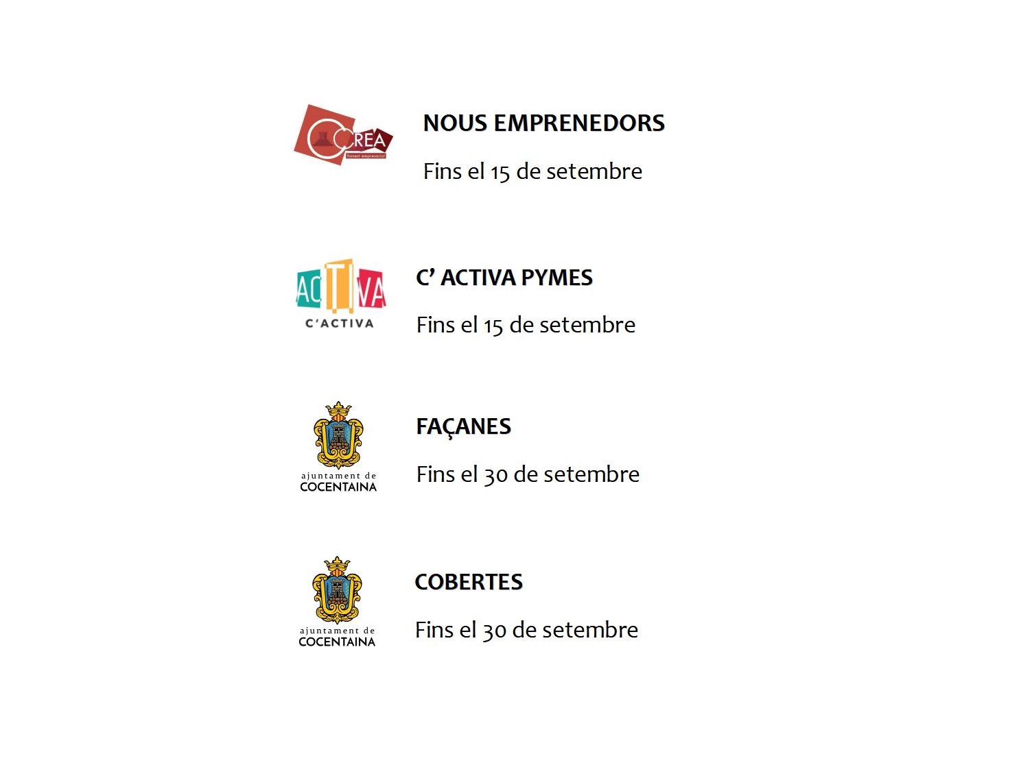Dos d’aquestes convocatòries són de l’àrea de Promoció Econòmica C’Crea, una línia d’ajudes amb finançament 100% municipal per a fomentar els negocis o les activitats econòmiques que hagen estat constituïdes entre l’1 de novembre de 2021 i el 31 de juliol de 2022. Aquestes ajudes es porten a terme per part de l’Ajuntament de Cocentaina des de 2016. L’altra línia de la mateixa àrea de Promoció Econòmica es C’Activa Cocentaina, amb finançament de la Diputació d’Alacant, l’objecte principal de la qual és pal·liar el efectes que han pogut tindre les pimes i micro-pimes a causa del Covid-19. El termini de presentació de sol·licituds per a aquestes dues convocatòries s’acaba el 15 de setembre.