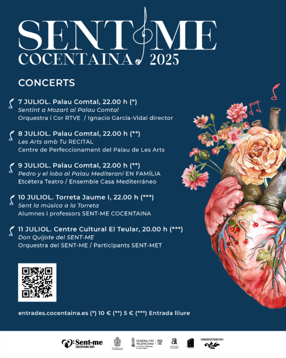 SENT-ME COCENTAINA celebra el 2025 l’11a edició. En aquests 12 anys de vida, SENT-ME ha anat revalidant la seua filosofia com a espai de convivència i diàleg, com a lloc de transformació social gràcies a la música. Cocentaina es converteix cada estiu en la casa d’artistes, professors i estudiants de música.