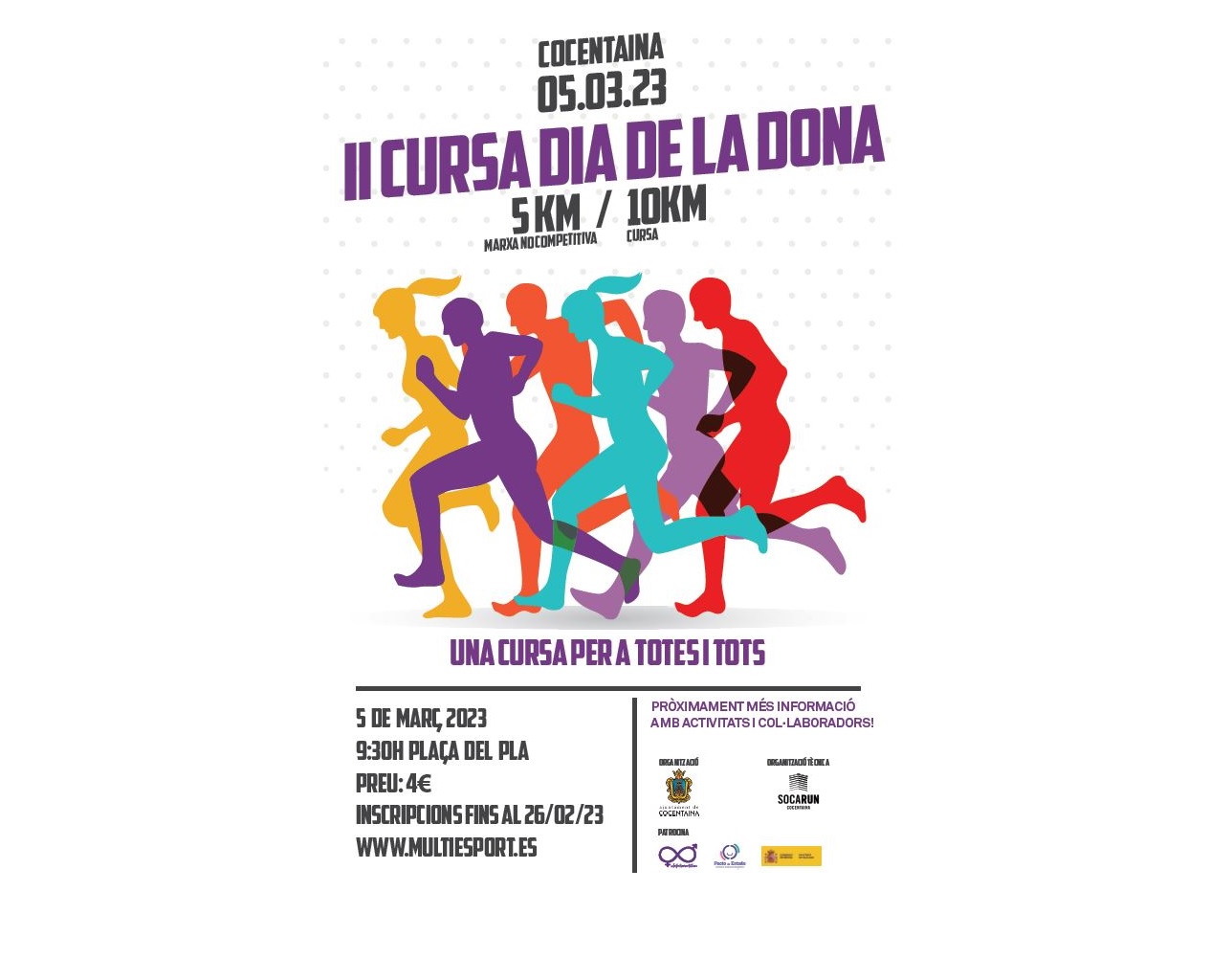 La cursa, a diferència d’altres, està oberta a la participació masculina i femenina i vindrà acompanyada d’activitats prèvies i posteriors a la seua finalització, amb entrega de trofeus per als corredors i corredores. El preu de la cursa popular és de 4€ i a més del dorsal i el segur corresponent, dóna dret a rebre una borsa amb el detall que l’ajuntament de Cocentaina ha preparat. L’organització tècnica va a càrrec del Socarun, qui un any més treballa colze a colze amb la regidoria de Benestar Social per oferir un diumenge ple d’esport i reivindicació de la igualtat.