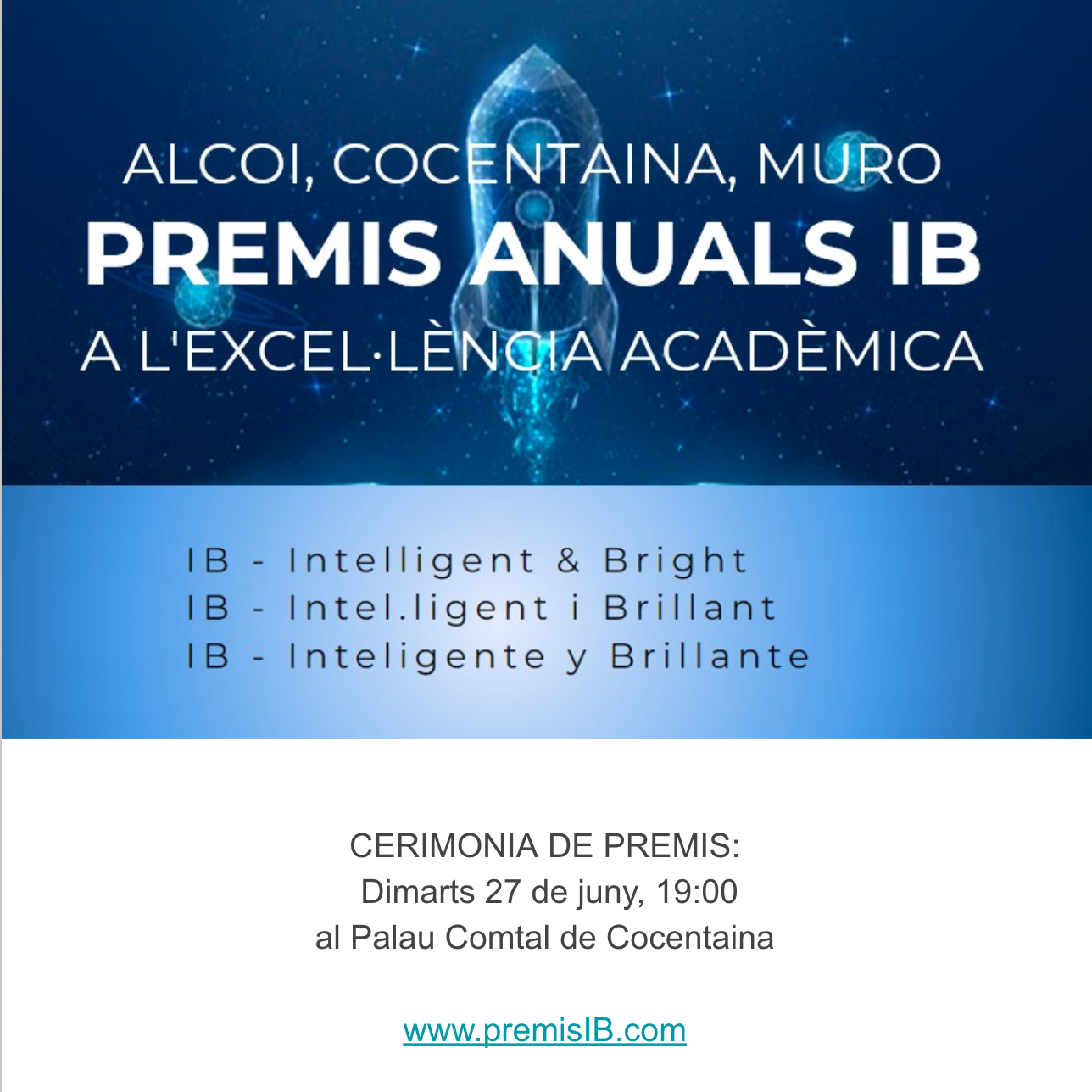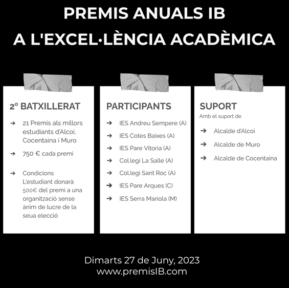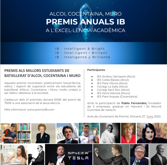 El próximo Martes 27 de Junio a las 19:00 tendrá lugar en el Palau Comtal de Cocentaina la segunda edición de los Premios IB a la excelencia académica patrocinados por la Fundación Iñaki Berenguer (www.premiosIB.com).