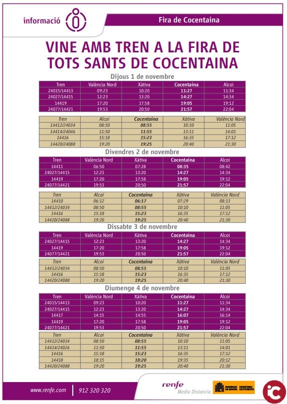 Es continua realitzant una important campanya de difusió de la Fira de Tots Sants a les principals estacions de rodalia, tant de València com de Castelló. A més, també es col·locaran cartells a l’interior dels vagons pels quals cada dia passen milers de persones que podran així assabentar-se de la celebració de la Fira de Cocentaina amb només un colp d’ull.