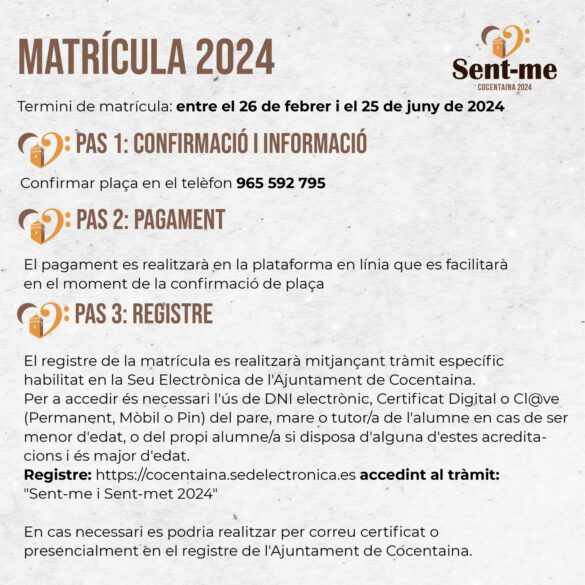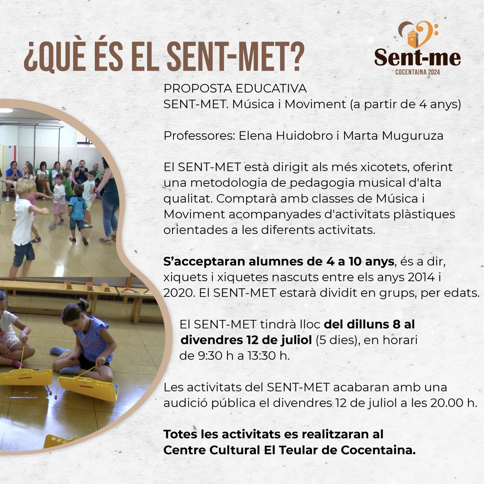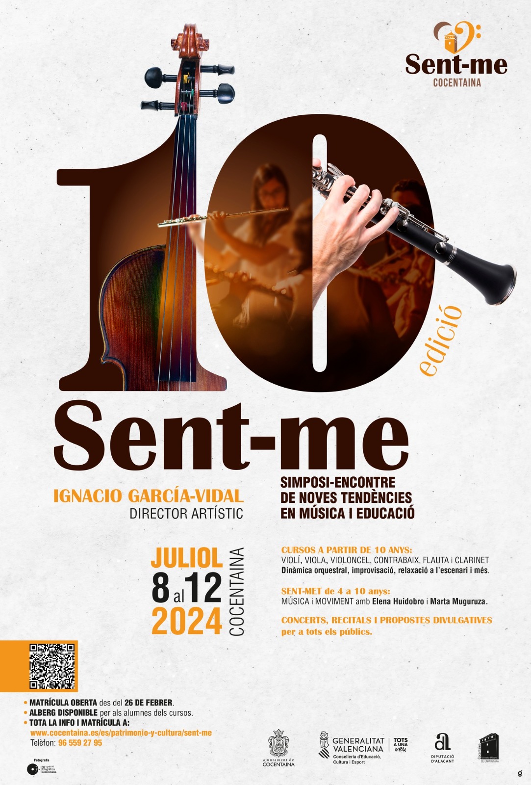 matrícules per orde d’arribada, oferint-se la possibilitat de participar com a alumne oïdor una vegada hagen sigut completades les places com a actiu. Cada nit el SENT-ME oferirà diferents concerts i actuacions, en els quals participaran grups de cambra, solistes, artistes convidats, orquestres, professors i alumnes. Perquè SENT-ME COCENTAINA reivindica en esta 10a edició la seua essència de trobada, el seu valor educatiu i divulgatiu, la seua vocació de fer arribar a tots els públics la música clàssica en formats atractius.