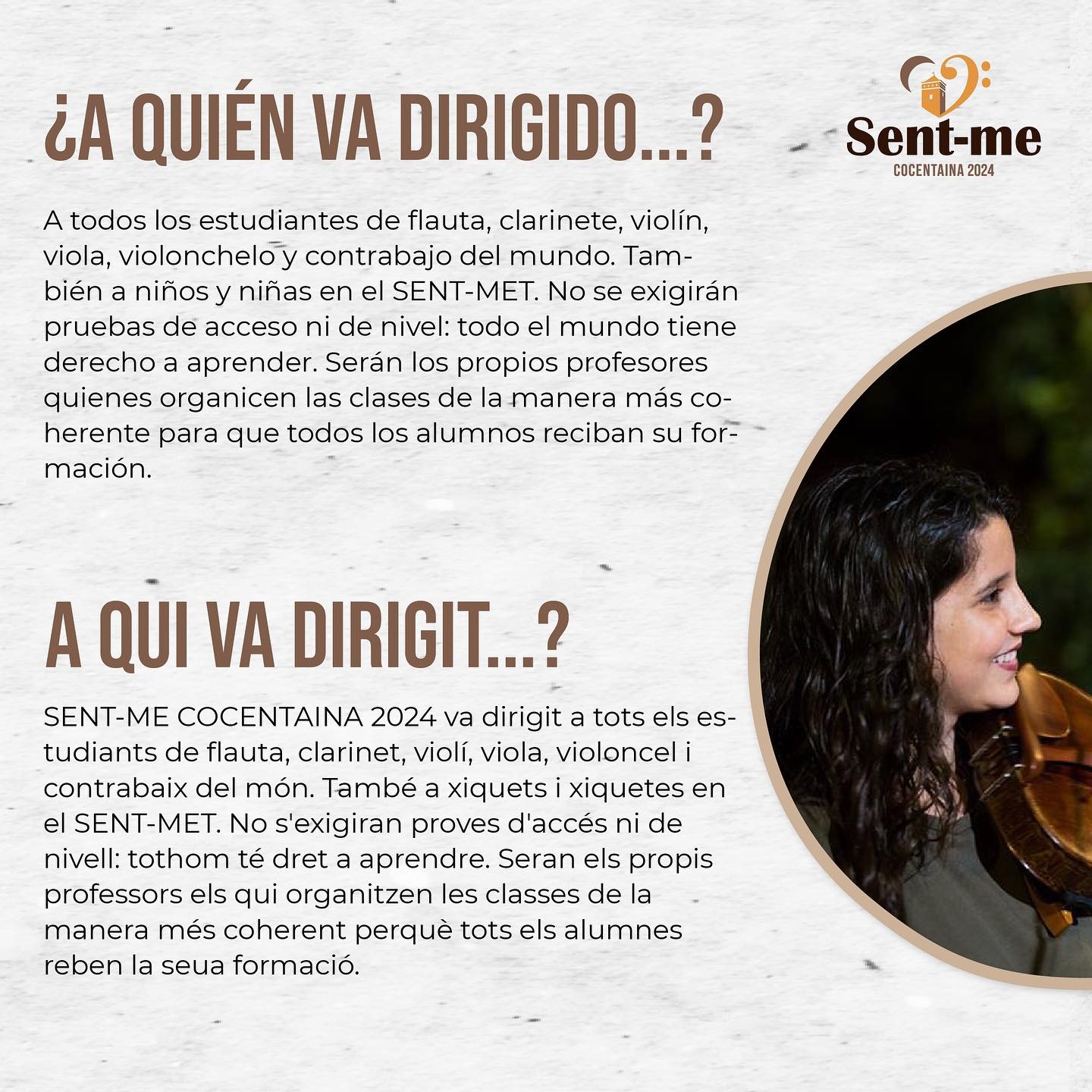 SENT-EM COCENTAINA 2024 va dirigit a tots els estudiants de flauta, clarinet, violí, viola, violoncel i contrabaix del món. També a xiquets i xiquetes en el SENT-ME. No s’exigiran proves d’accés ni de nivell: tothom té dret a aprendre. Seran els propis professors els qui organitzen les classes de la manera més coherent perquè tots els alumnes reben la seua formació. Encara que l’edat mínima recomanable dels alumnes és de 9/10 anys, poden estudiar-se casos particulars més joves. Seran ateses les