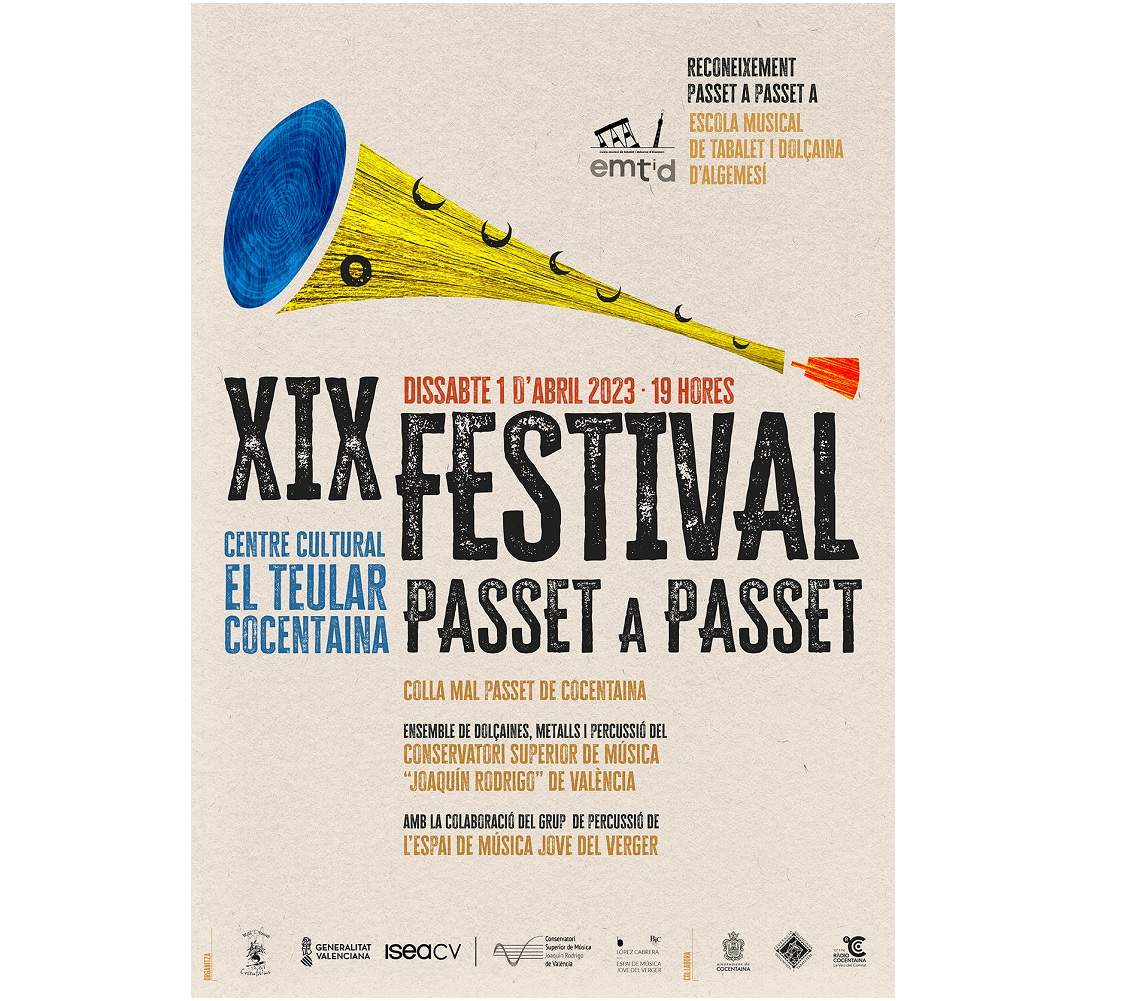 El dissabte 1 d’abril de 2023 a les 19:00 h al Centre Cultural El Teular de Cocentaina, tindrà lloc la XIX edició del Festival Passet a Passet que organitza anualment la colla contestana de dolçaines i tabals Mal Passet.
