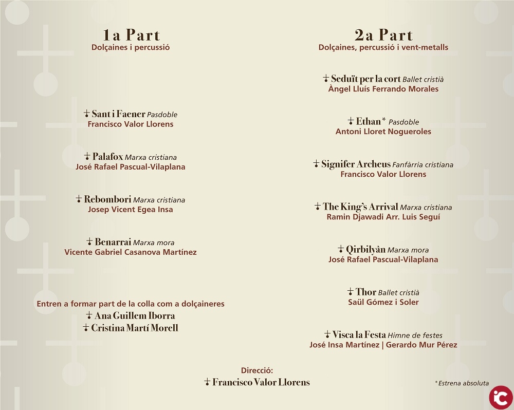 La colla contestana, dirigida per Francisco Valor, oferirà un programa de música festera per a dolçaina i percussió en la primera part, i una segona part amb la collaboració dun grup dinstruments de vent-metall. A més, diverses peces seran dirigides pels mateixos autors, com José Rafael Pascual Vilaplana, Josep Vicent Egea Insa i Vicent Casanova.